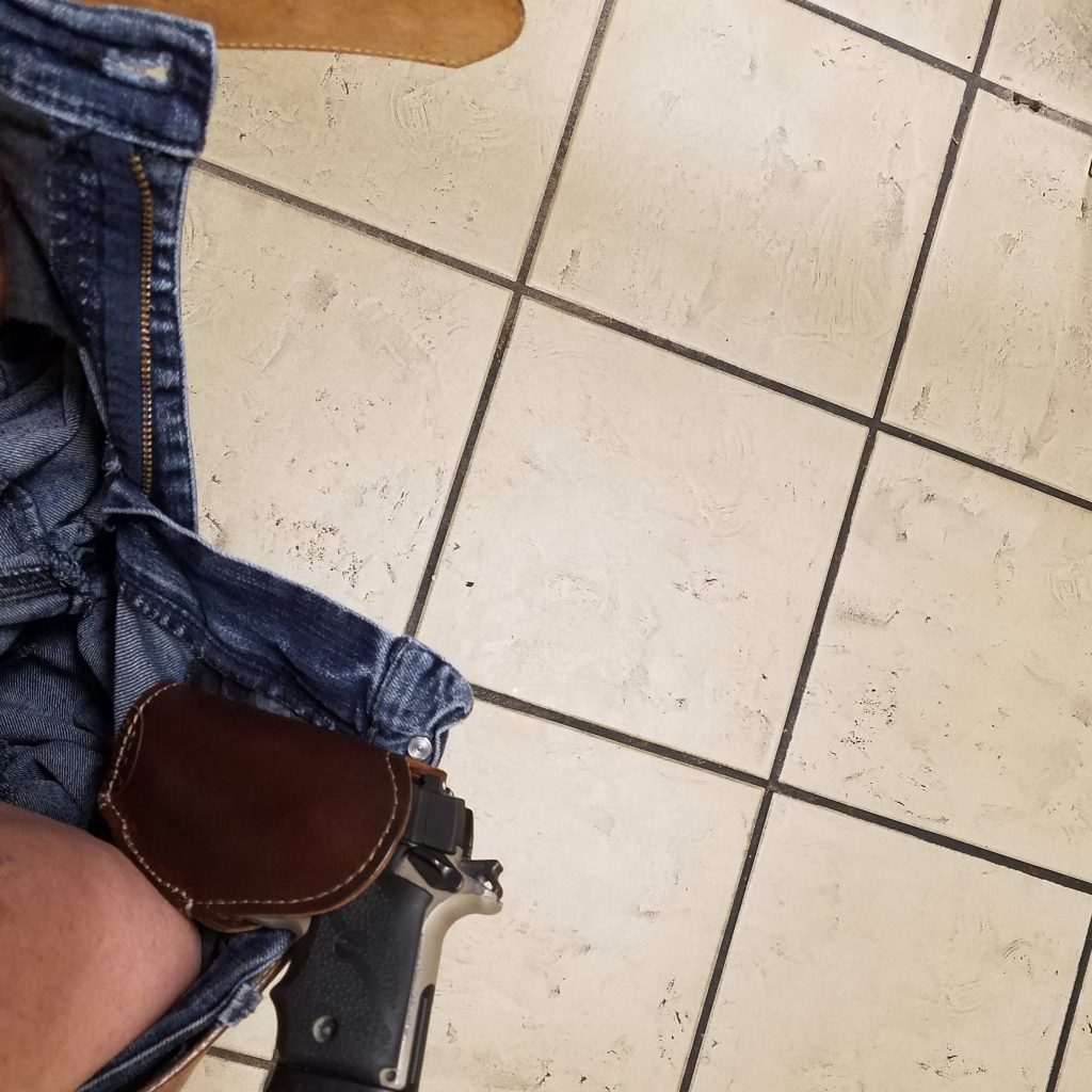 Bear in mind, as you carefully maneuver your pants and firearm in the privacy of your stall, its likely the firearm will flip or point at you. This breaks one of the critical laws of gun safety so take your time.