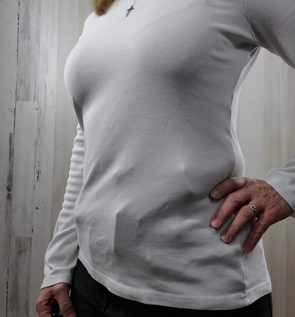 Carrying on my side, at a three o’clock position (or strong side) makes me look wider and shows the gun frame more. This isn’t comfortable for me or my hips .