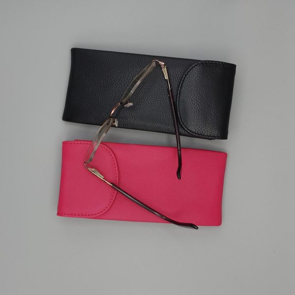 Quality leather in beautiful colors. The case expands to accommodate 2 pairs of glasses with a fold over snap closure.