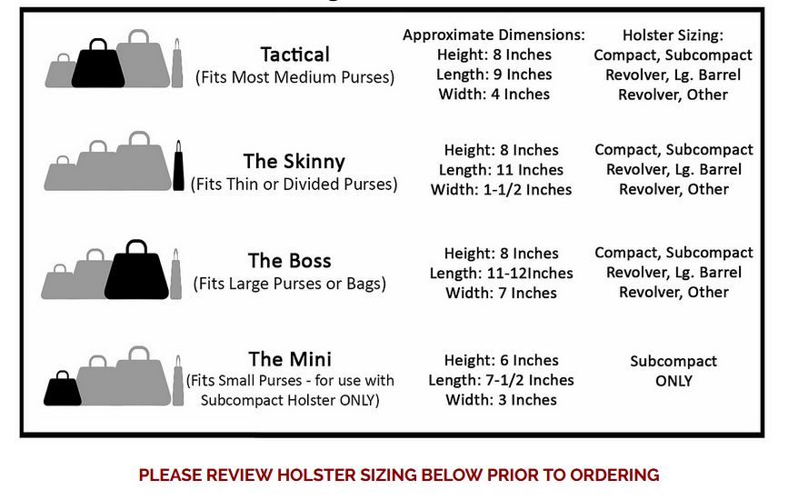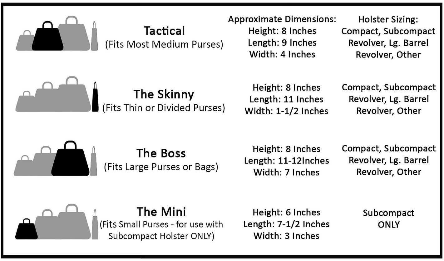 Boss Size  for larger bags and totes (approximately 30% larger organizer than Tactical, but with the same holster area) designed for those with larger purses.
