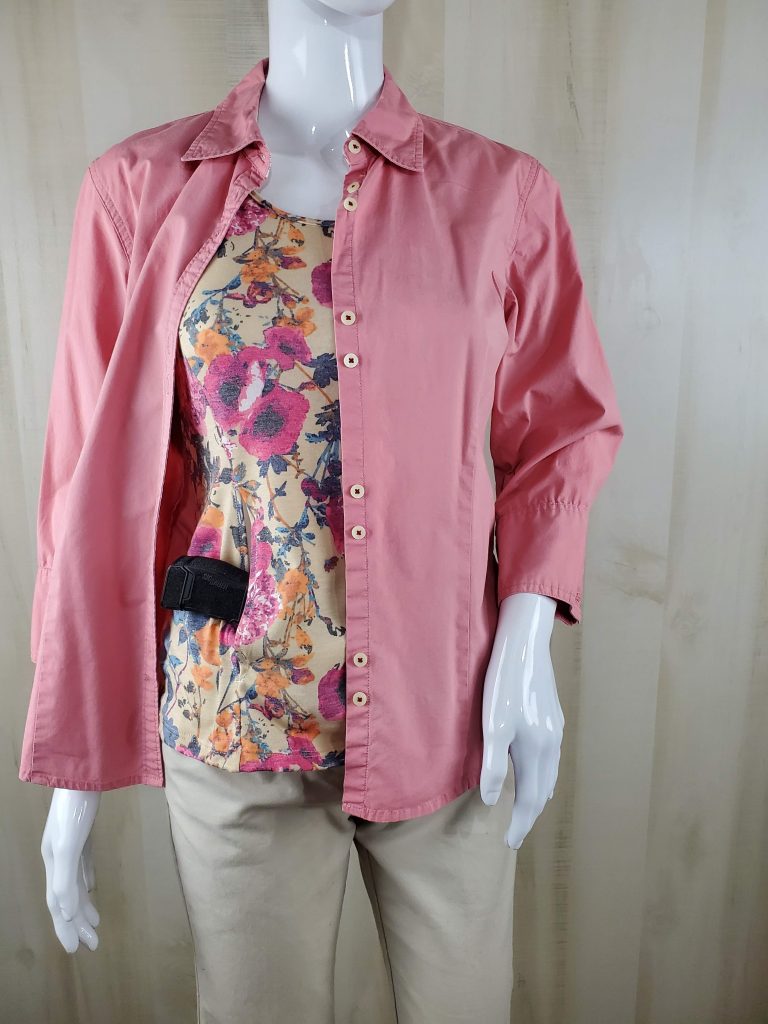 The coral pink in our floral Lion tank is right on que for a warm, welcoming embrace to warmer weather and the soft yellow background invites complete happiness ? of the upcoming season. Our “Lion” tank top is a lightweight fabric and layered with a cotton button up shirt. Wear it either with a few bottom buttons buttoned or tie up the ends to create fullness around your firearm. Of course, when the temperatures rise, roll up the sleeves. I love this look with cropped khaki pants. Stay cool with cotton or linen fabrics.