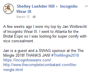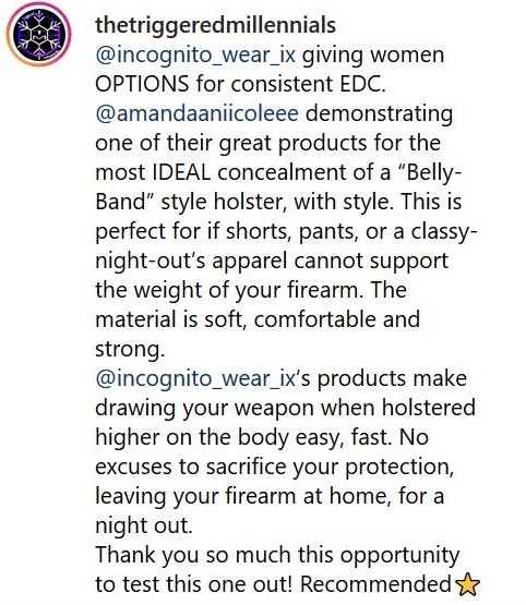 5 star 🌟🌟🌟🌟🌟 Company, Top notch 🔝🔟, 2nd to None🤴, EXCELLENT, and EVERYTHING Concealed Firearm Carry Apparel company…The Owner, Jan, is MOST KNOWLEDGEABLE…I am EXTREMELY SATISFIED with my purchase from INCOGNITO WEAR IX, and will CERTAINLY purchase again.