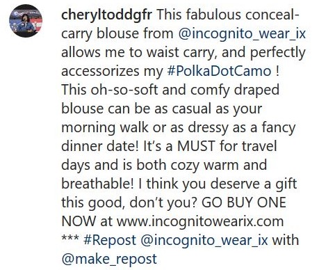 I enjoyed getting to chat with you ladies while there….I love your items. I purchased 2 of the same style shirts last year at the USCCA Expo in Louisville and I was so excited to see you in Pittsburgh this year”.
