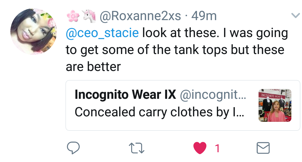 “This lady is very friendly, and has a great sense of fashion for concealed carry needs! Thank you so much!”